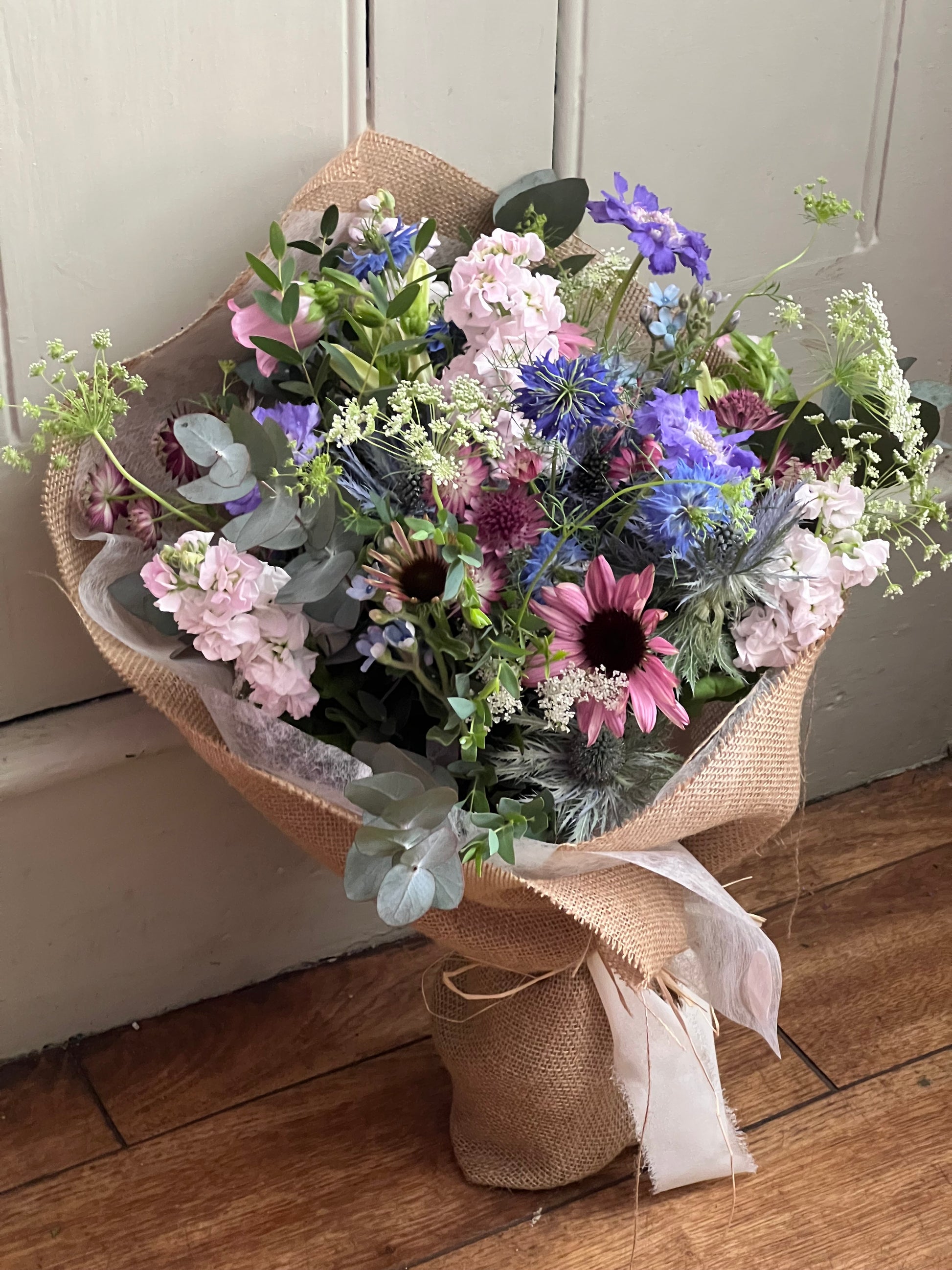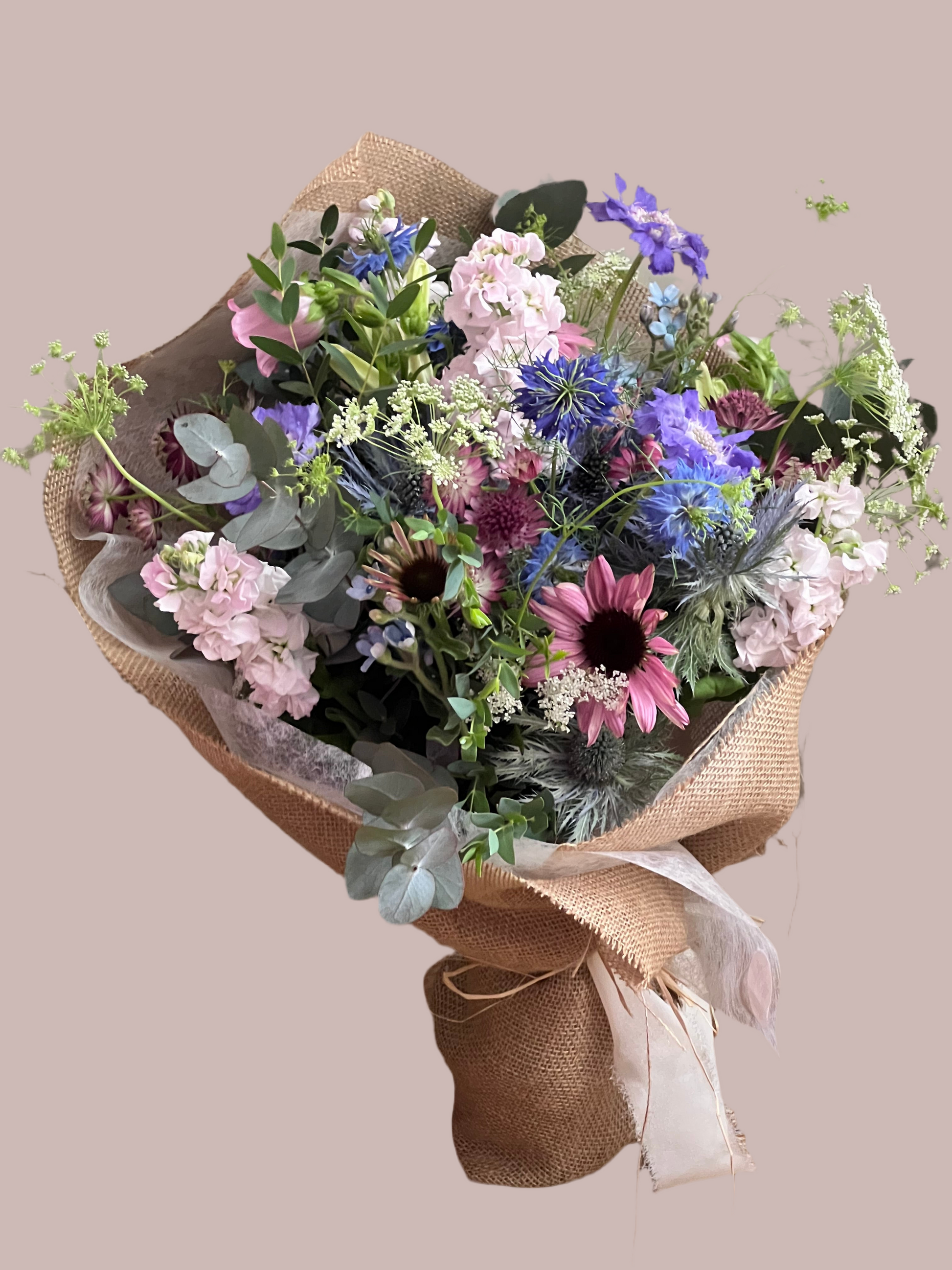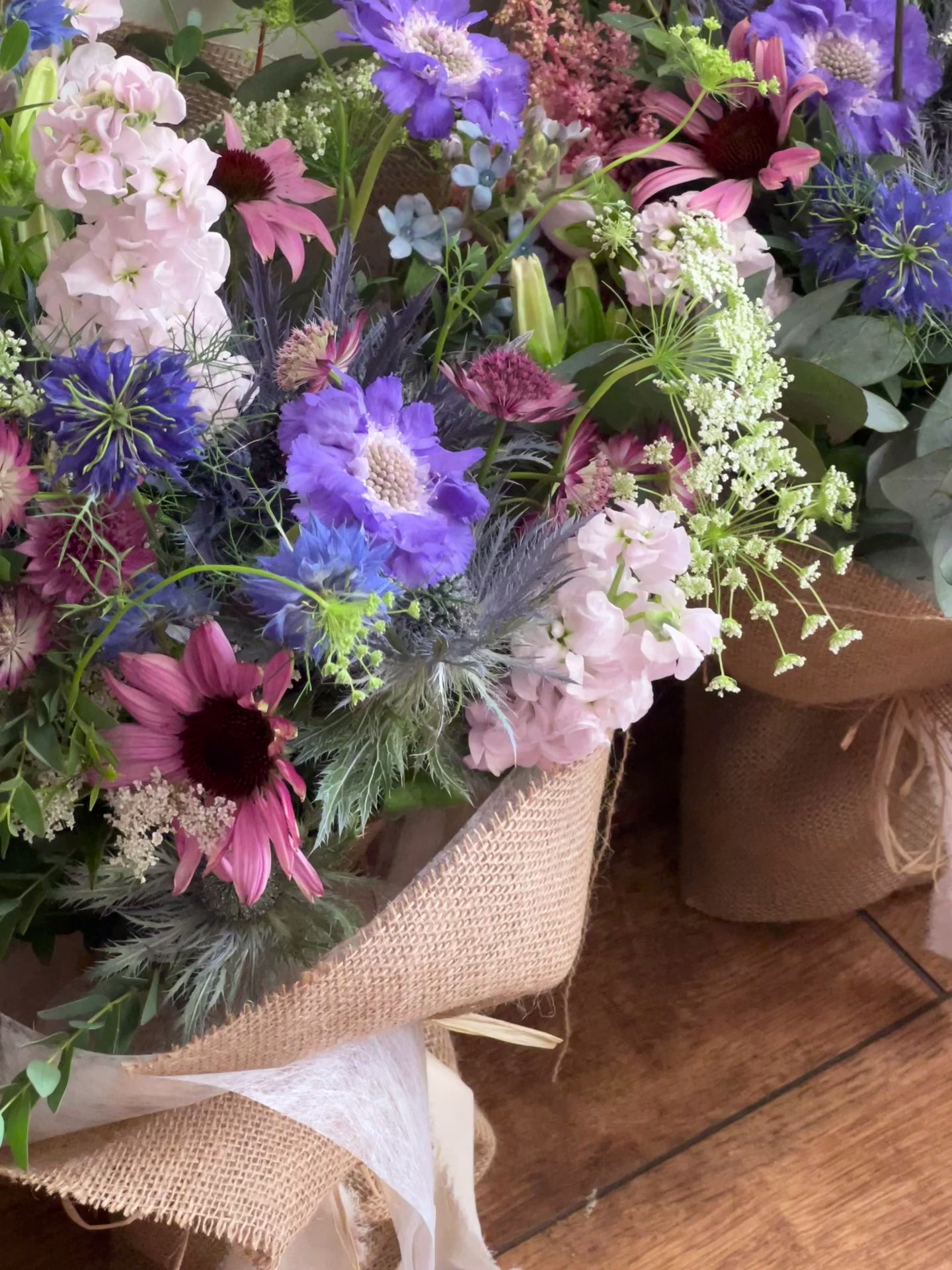 The water bags are then wrapped in compostable white tissue paper and tied with raffia. We then wrap the flowers in a soft whit plant based material for added protection and presentation and then carefully wrap the flowers in an outer layer of hessian which is again completely compostable.